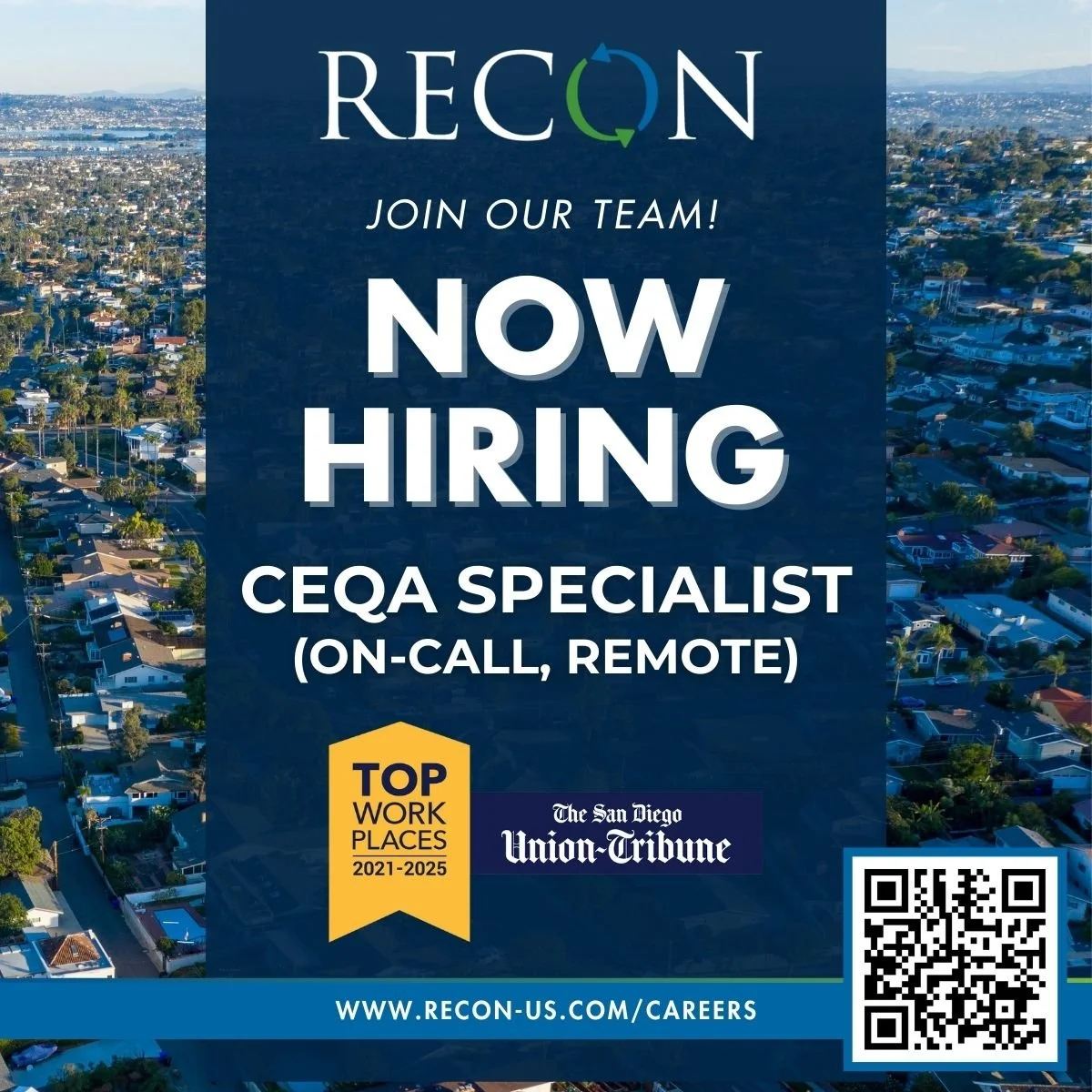 RECON is proud to be recognized as a 2025 Top Workplace by The San Diego Union-Tribune, ranking number five among small companies! We are also honored to receive the 2025 Work/Life Flexibility Award. Past special awards won include awards for excellence in leadership and work-life balance. Thanks to our amazing employees for making this achievement possible!